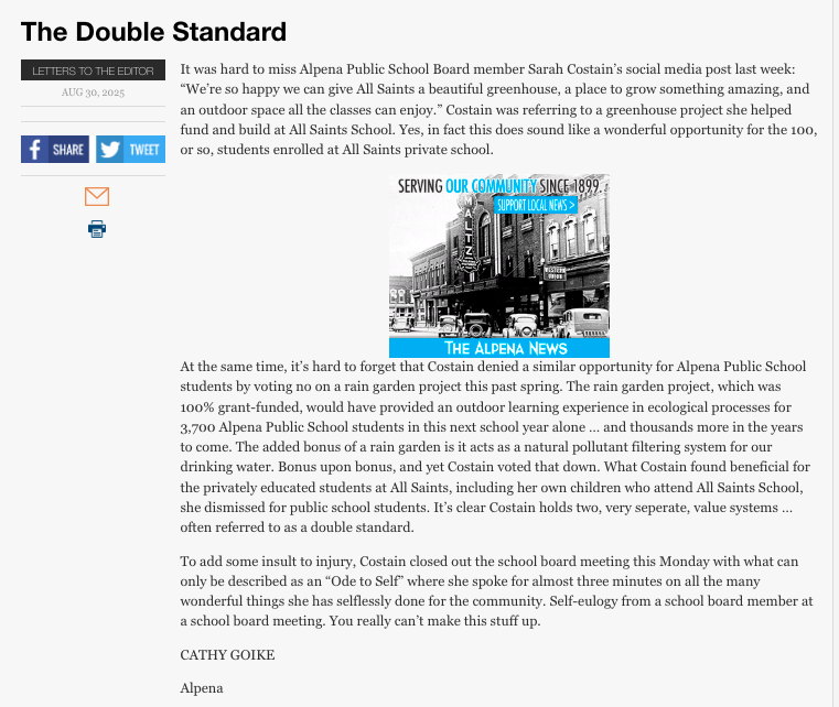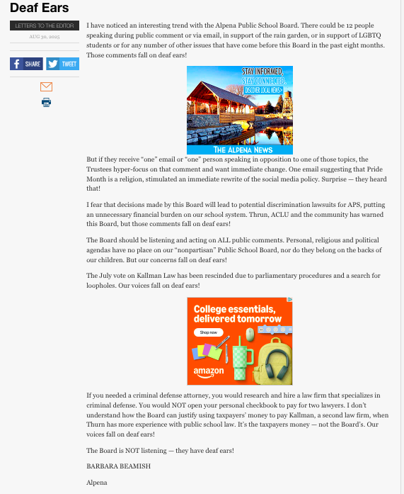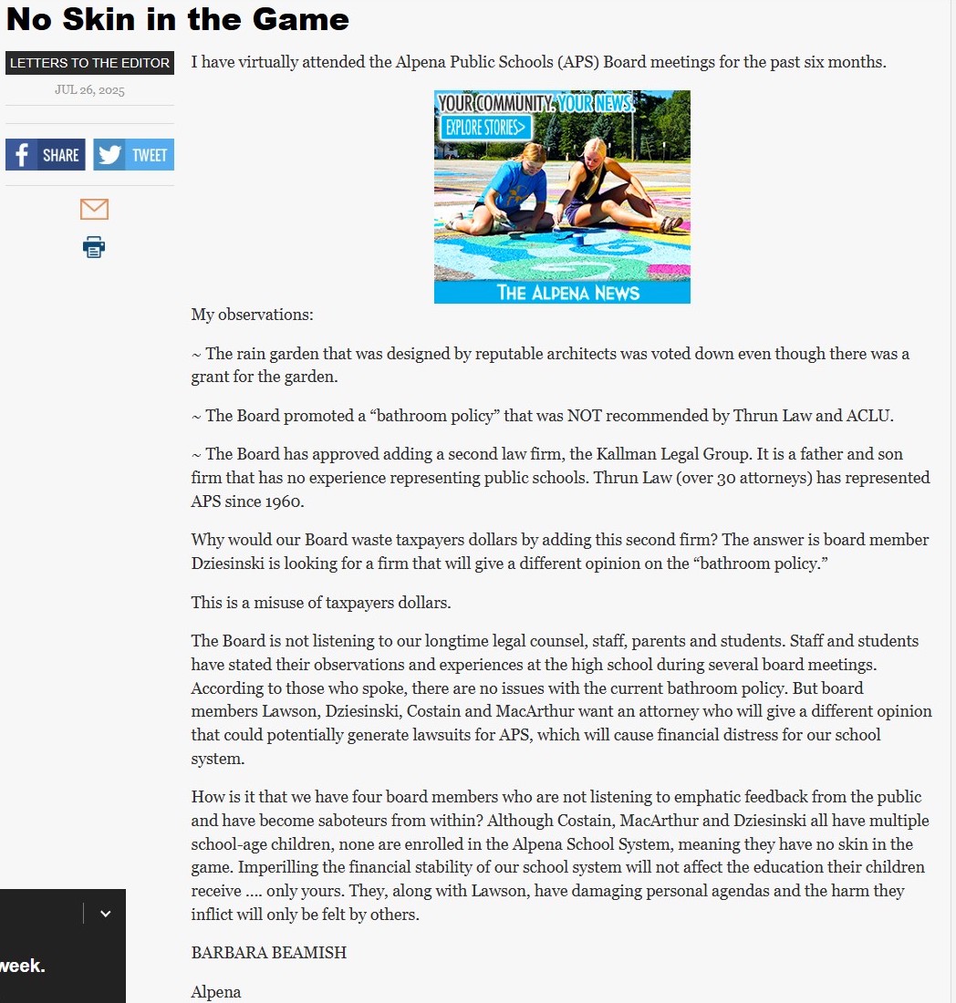 So, what have Dziesinski, Lawson, Costain, and MacArther done? Ignored and belittled parents, ignored students, ignored staff, and ignored the districts law firm, and instead they continued to pursue the policy, wasting our tax dollars by pushing to hire an extremist and unqualified lawyer that has agreed to pursue a law suit to enact the policy they are determined to put in place, despite widespread opposition by the Alpena community.